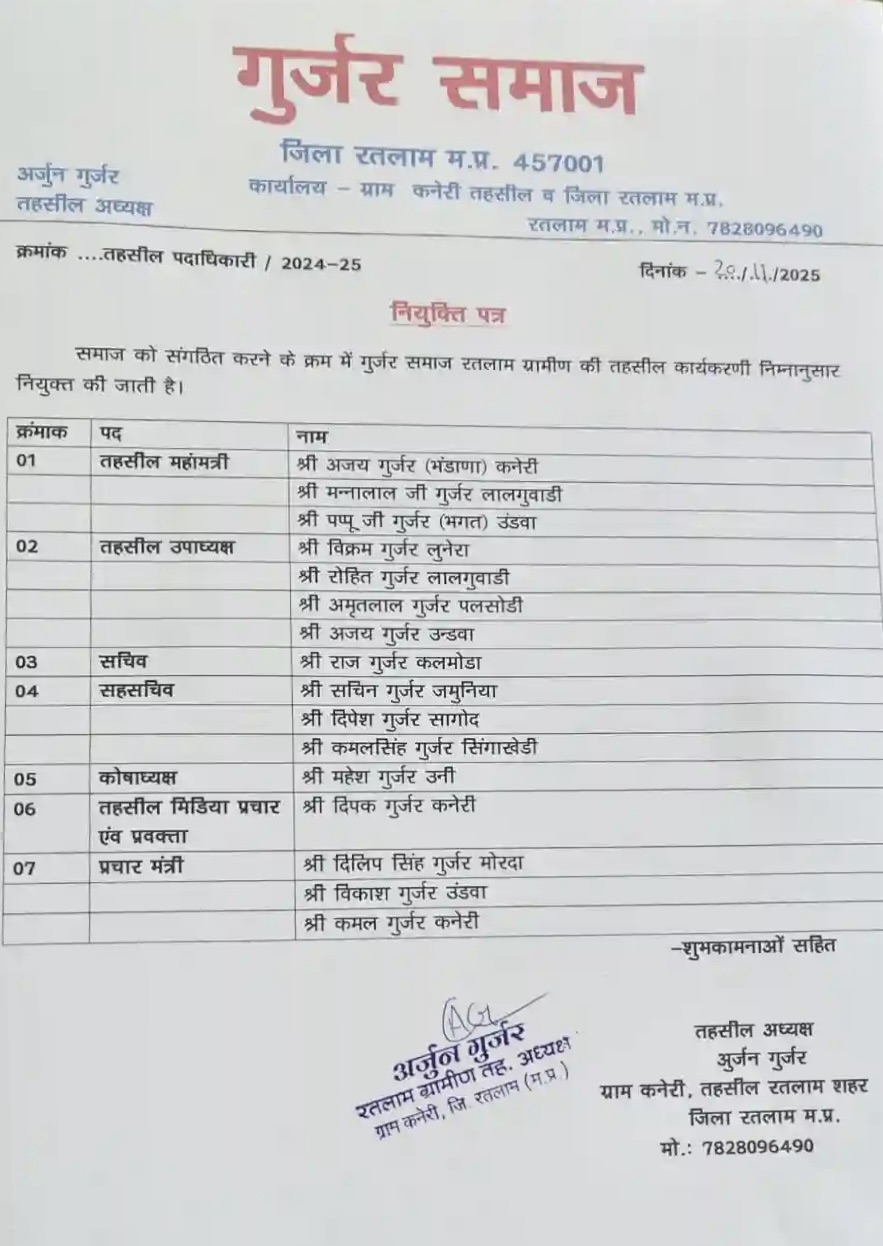रतलाम- पब्लिक वार्ता, न्यूज़ डेस्क। Ratlam News: गुर्जर समाज रतलाम ग्रामीण में संगठन विस्तार को लेकर महत्वपूर्ण कदम उठाते हुए तहसील अध्यक्ष अर्जुन गुर्जर कनेरी
