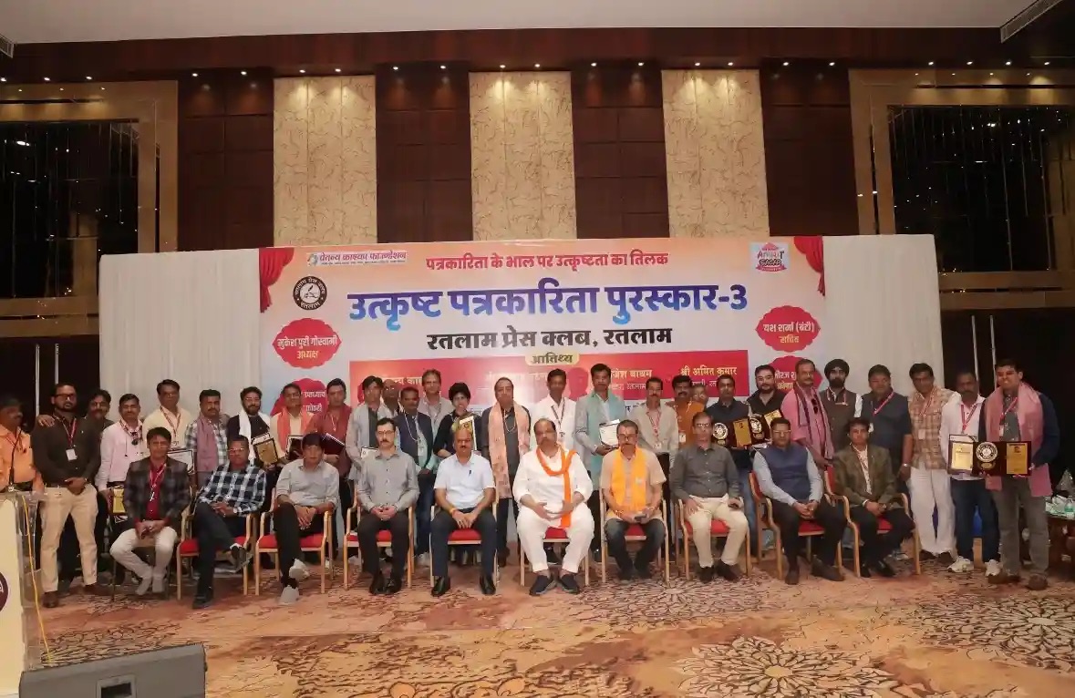 रतलाम- पब्लिक वार्ता,न्यूज़ डेस्क। Ratlam News:  रतलाम प्रेस क्लब द्वारा आयोजित “पत्रकारिता के भाल पर उत्कृष्टता का तिलक” पुरस्कार समारोह-3 का भव्य आयोजन शनिवार को