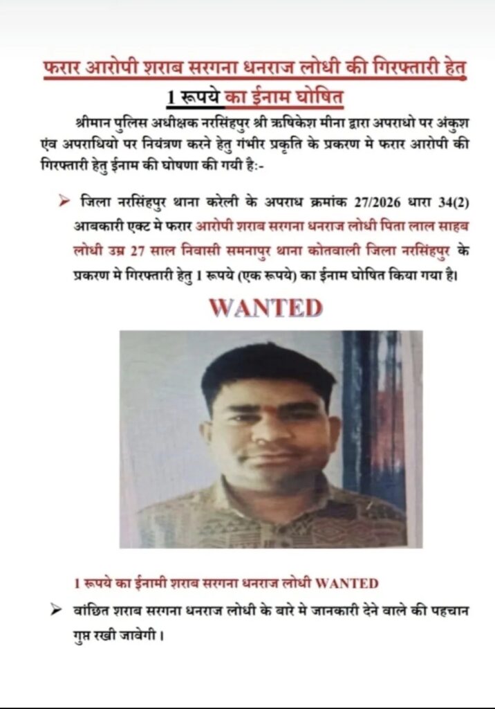 न्यूज़ डेस्क। MP News: मध्य प्रदेश के नरसिंहपुर जिले में पुलिस ने अनोखी रणनीति अपनाकर फरार शराब माफिया को सरेंडर करने पर मजबूर कर दिया। पुलिस ने फरार शराब तस्कर धनराज लोधी पर महज एक रुपए का इनाम घोषित किया था, जिसने उसकी ‘हनक’ तोड़ दी और अंततः आरोपी को खुद पुलिस के सामने सरेंडर करना पड़ा।