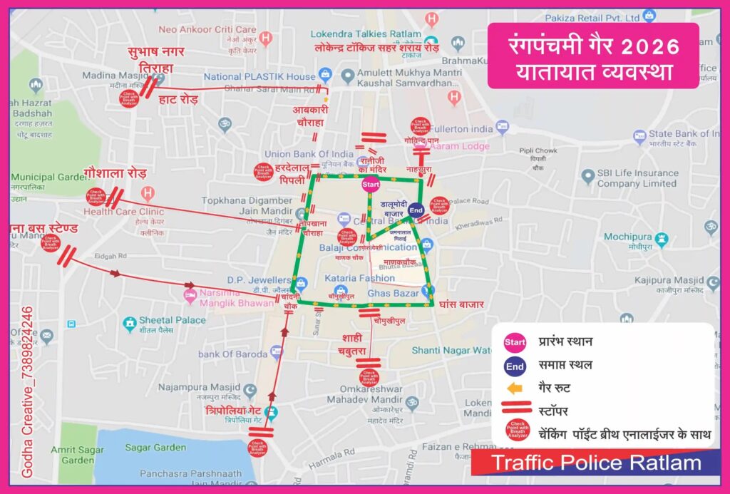 न्यूज़ डेस्क। Ratlam News: रंगपंचमी पर्व के अवसर पर 8 मार्च 2026 को रतलाम जागृति मंच द्वारा परंपरागत गैर जुलूस निकाला जाएगा। यह गैर सुबह 11 बजे से दोपहर 4 बजे के बीच शहर के विभिन्न प्रमुख मार्गों से होकर गुजरेगी। जुलूस में बड़ी संख्या में लोगों की भागीदारी को देखते हुए रतलाम यातायात पुलिस ने विशेष ट्रैफिक डायवर्जन प्लान तैयार किया है।